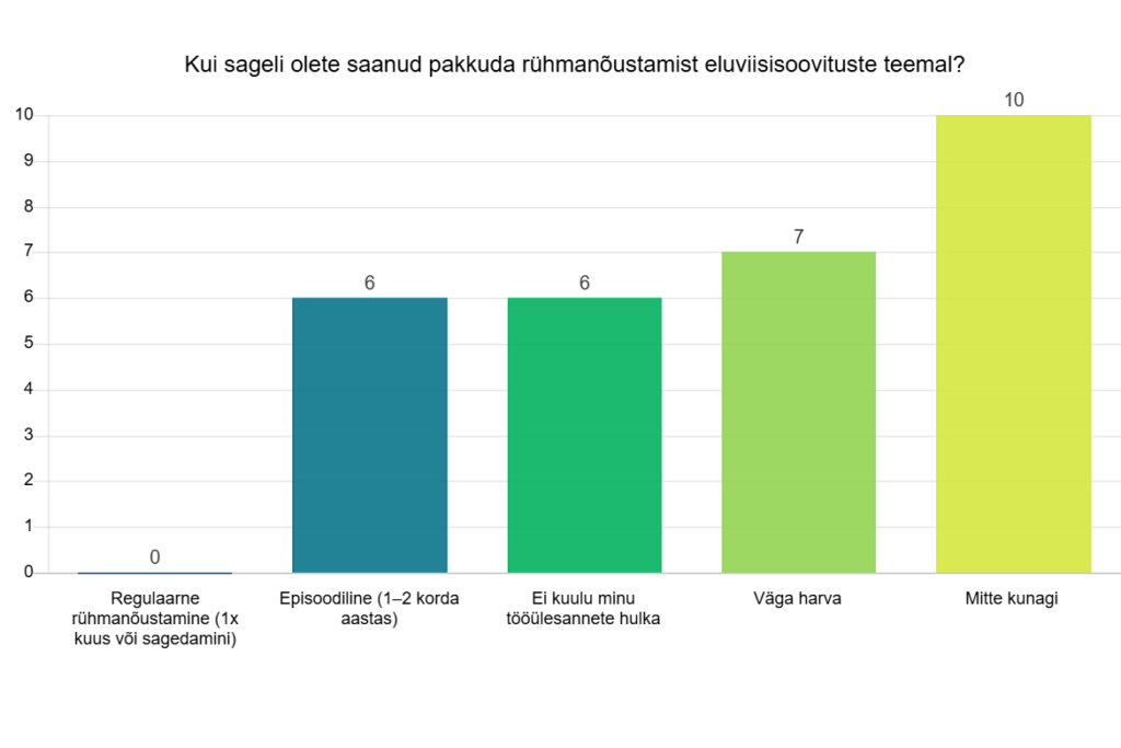 Patsientide motivatsioon eluviisi muuta kogus viiepalliskaalal keskmiseks punktisummaks 3,04. Kõige sagedamini kasutati toitumispäevikut (92,9%) ja liikumispäevikut (82,2%). Unepäevikut ja haigusega toimetuleku küsimustikke kasutati harvem. Vaimse tervise hindamiseks mõeldud tööriistu (sh EEK-2) kasutati vaid osaliselt. 35,7% vastanutest ei kasutanud neid üldse. Tulemused näitavad, et rühmanõustamine eluviisisoovituste teemal on harva kasutusel ja pole piisavalt rakendunud. Regulaarset rühmanõustamist ei paku ükski vastanu, puhuti teeb seda 6 ja väga harva 7 vastanut. Enamik pole seda kunagi teinud ning 6 märkis, et see ei kuulu nende tööülesannete hulka (joonis 2).