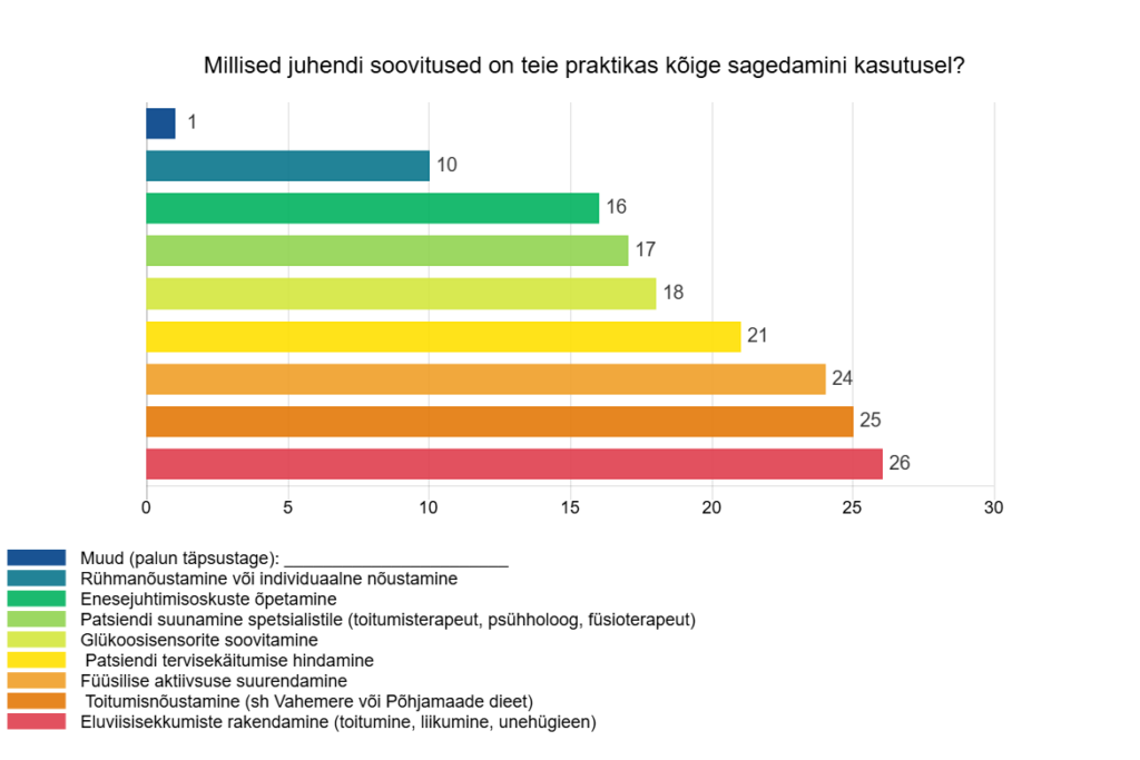 Uuringu tulemused näitavad, et praktikas kasutatakse enim toitumisnõustamise ja elustiilisoovituste rakendamist (mõlemad 16%). Peaaegu sama sageli rakendatakse soovitusi füüsilise aktiivsuse suurendamiseks (15%) ja tervisekäitumise hindamiseks (13%). Harvem kasutatakse juhendi soovitusi (mõlemad 11%) ning enesepiirangute õpetamist (10%). Rühma- ja individuaalnõustamist mainis vaid 6% vastanutest. Seega igapäevapraktikas keskendutakse peamiselt elustiili ja käitumuslike tegurite toetamisele, samas kui tehnoloogiapõhised sekkumised ja multidistsiplinaarne koostöö on vähem levinud (joonis 1).